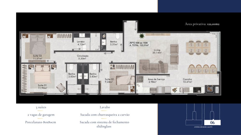 - Área Privativa: 122,01 m²