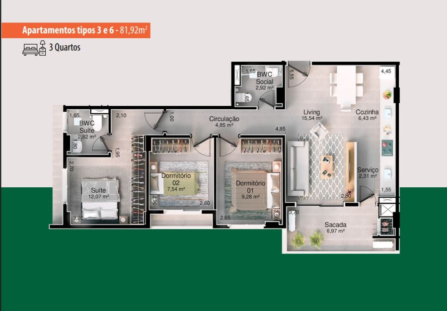 - Área Privativa: 81,92 m²