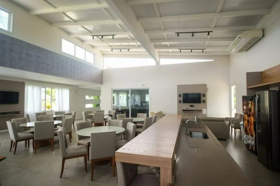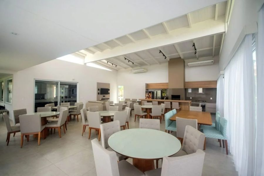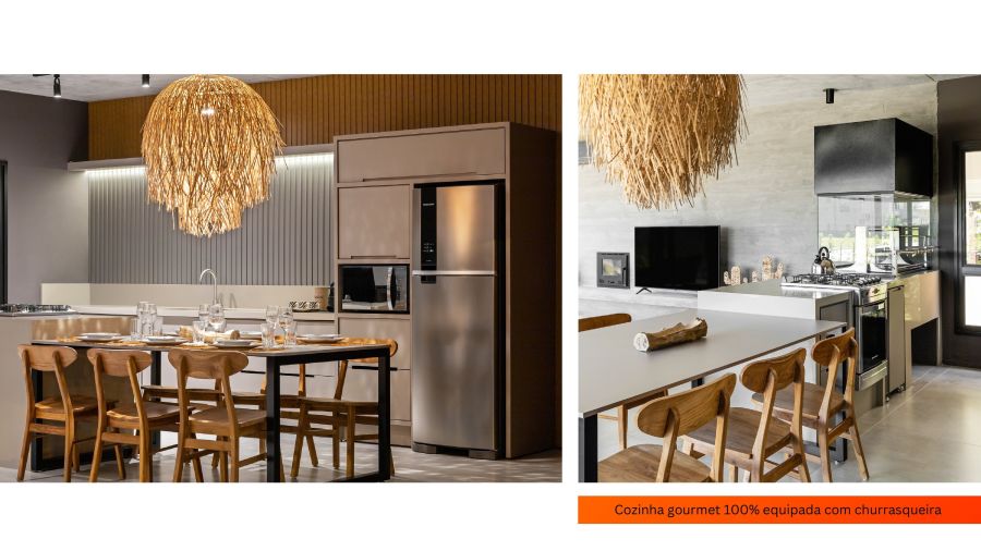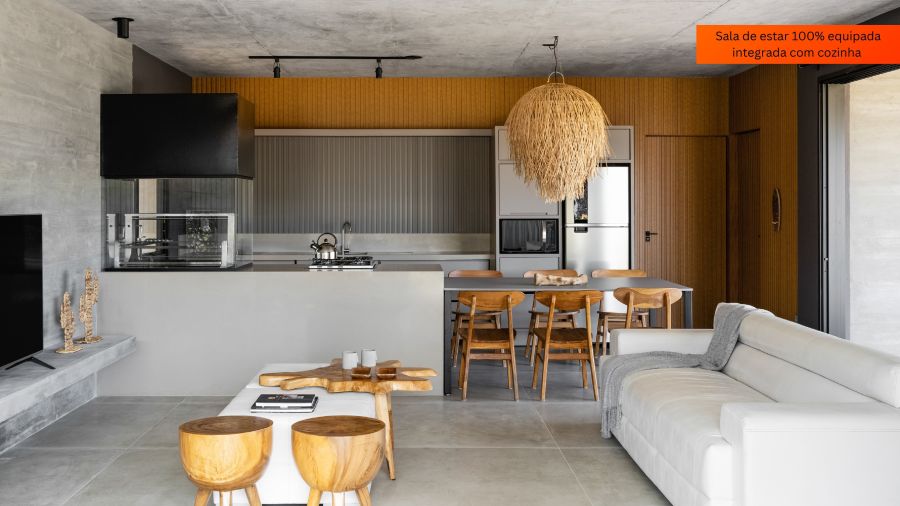 O projeto prioriza ambientes amplos e integrados, com cozinha planejada conectada à sala de estar, proporcionando funcionalidade e excelente iluminação natural. A área social se estende para o espaço externo, ideal para momentos de lazer e convivência.