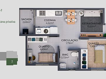 Os apartamentos possuem área privativa entre 41,84m² e 43,25m², distribuídos de forma inteligente em 2 dormitórios, 1 banheiro social, sala de estar e jantar integradas, sacada com gradil em vidro e churrasqueira metálica a carvão, proporcionando conforto e lazer no próprio imóvel. As unidades contam ainda com 1 vaga de estacionamento descoberta e individual.