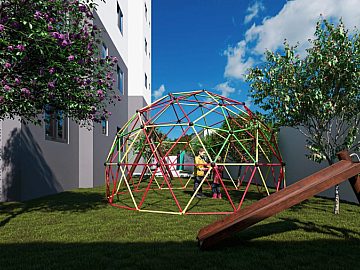 O condomínio oferece hall de entrada decorado, sistema de porteiro eletrônico sem fio com tecnologia GSM para comunicação individual (interfone) e áreas de lazer completas para toda a família, como salão de festas mobiliado com churrasqueira, área kids e playground externo. O empreendimento também possui captação dos drenos de ar-condicionado para irrigação das áreas verdes, agregando eficiência ambiental ao projeto.