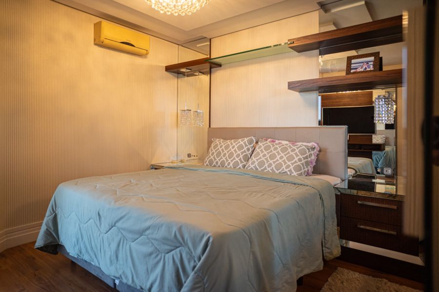 A cobertura conta com acabamento em gesso, piso em porcelanato, móveis planejados, armários embutidos, ar-condicionado instalado e fechadura com senha na porta de entrada, agregando tecnologia e segurança ao dia a dia.
